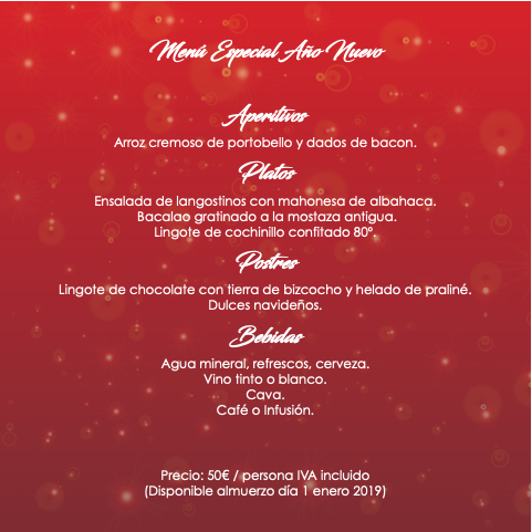 Precio: 50€ / persona IVA incluido (Disponible almuerzo día 1 enero 2019)